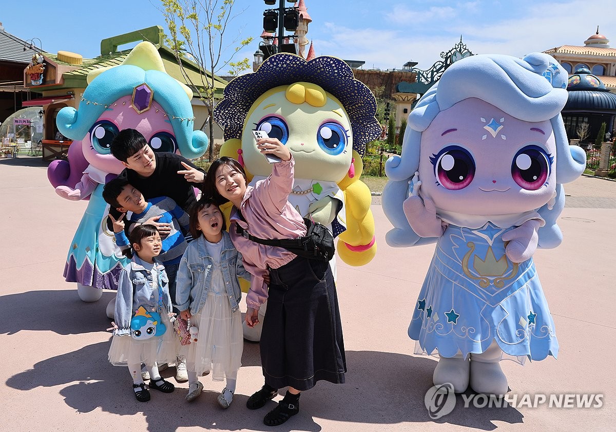 (부산=연합뉴스) 강선배 기자 = 28일 부산 기장군 롯데월드 어드벤처 부산을 찾은 한 가족이 인기 캐릭터 '티니핑'과 기념사진을 찍고 있다.