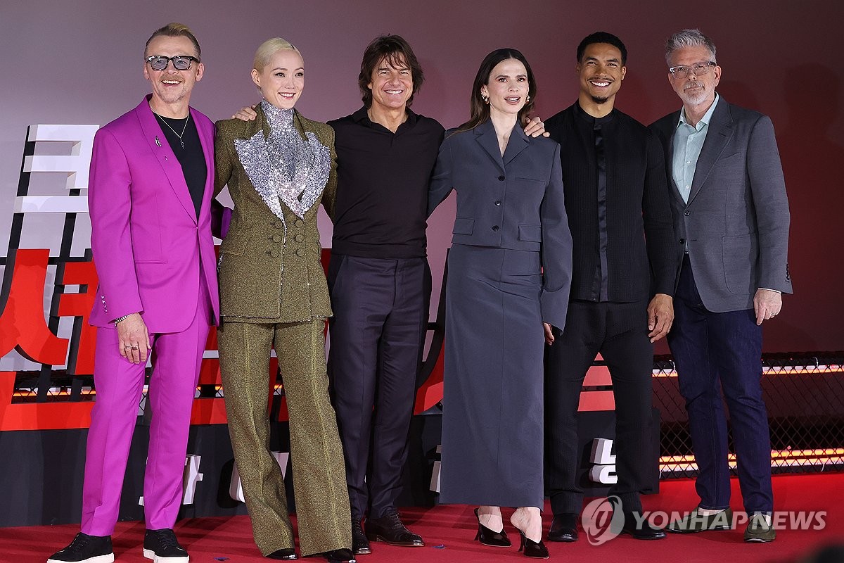 (서울=연합뉴스) 강민지 기자 = 8일 서울 송파구 롯데시네마 월드타워에서 열린 영화 '미션 임파서블: 파이널 레코닝' 기자간담회에서 감독과 배우들이 포즈를 취하고 있다. 왼쪽부터 사이먼 페그, 폼 클레멘티에프, 톰 크루즈, 헤일리 앳웰, 그레그 타잔 데이비스, 크리스토퍼 맥쿼리 감독.