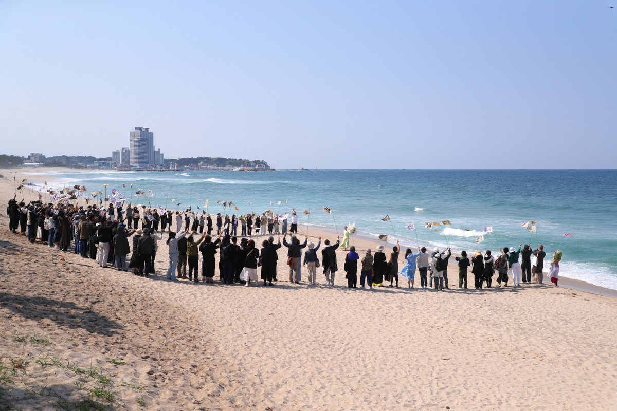 이들은 소나무 숲에서 박정자의 지휘에 따라 행진을 시작해 해변까지 내려갔다. 소프라노 임선혜가 부른 '환한 웃음으로'가 스피커를 타고 흐르자, 울지 말고 웃으라는 박정자의 당부에도 어떤 이들은 북받치는 감정을 누르지 못하고 눈물을 터뜨렸다.
