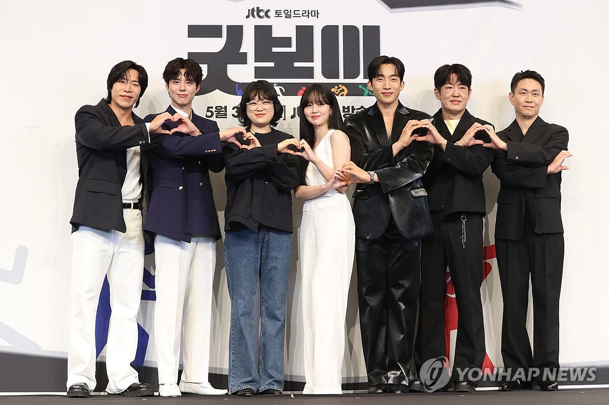 (서울=연합뉴스) 강민지 기자 = 29일 서울 구로구 더링크서울호텔에서 열린 JTBC 새 토일드라마 '굿보이' 제작발표회에서 연출과 배우들이 포즈를 취하고 있다. 왼쪽부터 태원석, 박보검, 심나연 연출, 김소현, 이상이, 허성태, 오정세. 2025.5.29