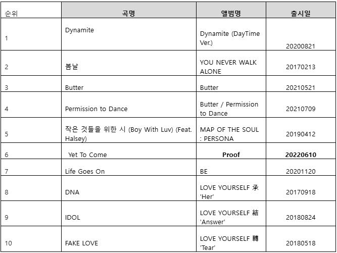 상대적으로 최근인 2022년 6월 발매된 앤솔러지(선집) 앨범 타이틀곡 '옛 투 컴'(Yet To Come)은 쟁쟁한 대표곡을 제치고 6위를 차지해 눈길을 끌었다.