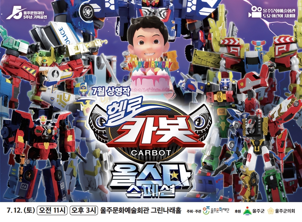 (울산=연합뉴스) 장영은 기자 = 울산 울주문화재단은 오는 7월 12일 오전 11시와 오후 3시 두 차례에 걸쳐 울주문화예술회관 그린나래홀에서 애니메이션 영화 '헬로카봇 올스타스페셜'을 무료 상영한다고 12일 밝혔다.