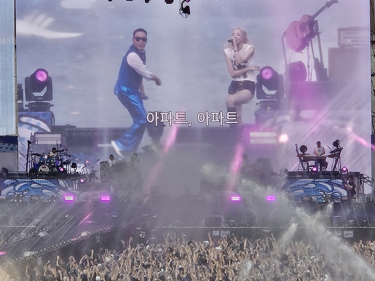 (인천=연합뉴스) 가수 싸이와 로제가 인천 아시아드주경기장에서열린'싸이 흠뻑쇼-서머 스웨그 2025'에서 무대를 선보이고 있다. 2025.6.28 photo@yna.co.kr