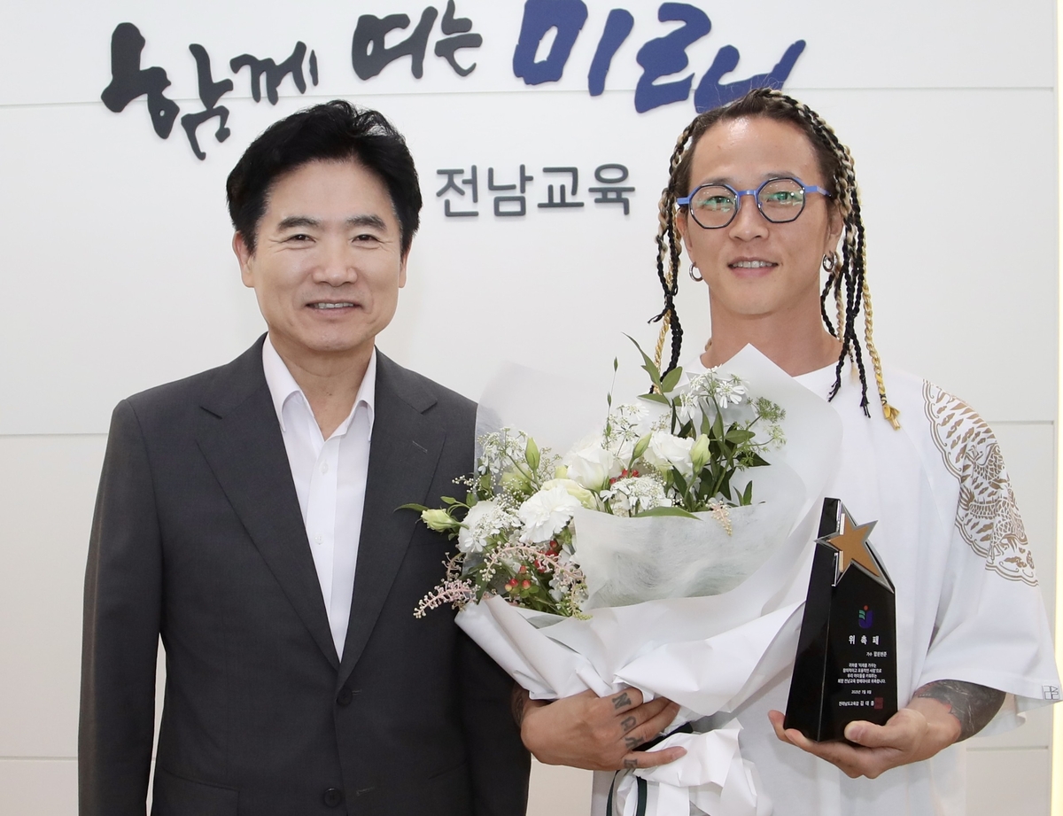 (무안=연합뉴스) 여운창 기자 = 전남도교육청은 8일 청사 교육감실에서 '희망 전남 교육 명예대사'에 가수 팝핀현준을 위촉했다.