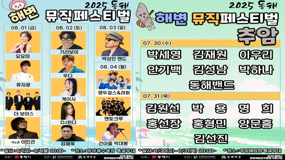 동해문화관광재단 관계자는 "해변 뮤직 페스티벌은 지역 예술인과 대중 가수가 함께 만드는 음악 축제"라며 "여름철 동해의 밤을 대표하는 문화관광 콘텐츠로서 자리매김할 수 있도록 철저히 준비하겠다"고 말했다.
