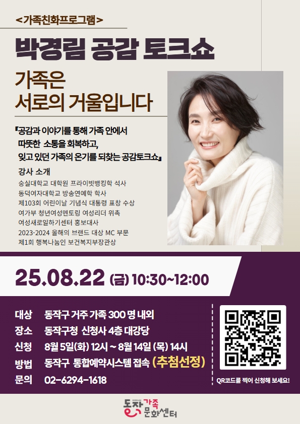 박경림이 '가족은 서로의 거울입니다'라는 주제로 ▲ 가족 구성원의 다양한 모습과 기대의 차이 ▲ 공감과 소통은 연습하는 것 ▲ 갈등과 오해를 줄이기 위한 대화법 등에 관해 이야기를 들려줄 예정이다.