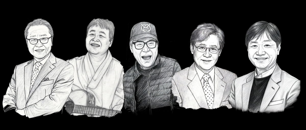 왼쪽부터 방송인 이상벽, 가수 송창식, 조영남, 윤형주, 김세환 [쇼플러스 제공. 재판매 및 DB 금지]