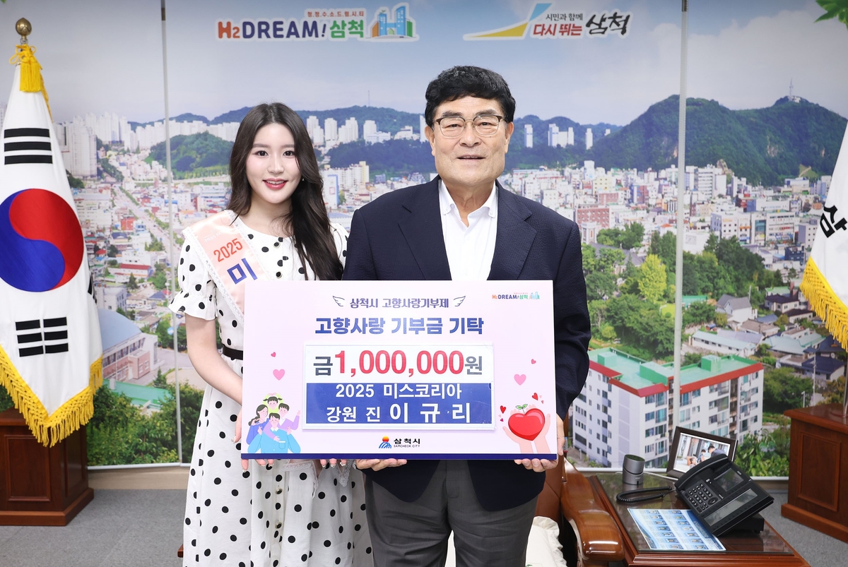 (삼척=연합뉴스) 유형재 기자 = 2025 미스코리아 강원 진(眞) 이규리씨가 14일 삼척시청을 방문, 고향사랑기부금 100만원을 전달했다.