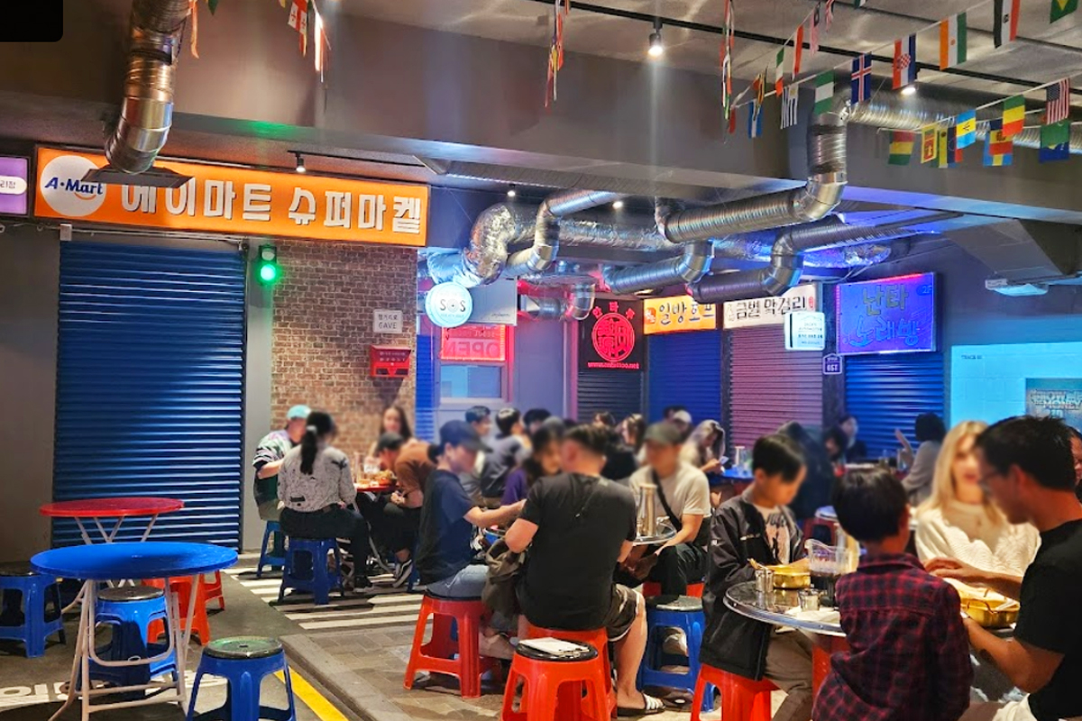 실내 포장마차에는 한국 문화를 체험하기 위한 현지인들로 북적입니다.