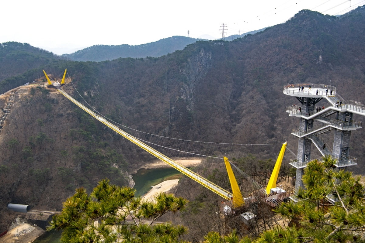 이곳은 길이 200m, 높이 100m, 그리고 폭 1.5m의 국내 최장, 최고 규모의 흔들다리인 ‘원주 소금산 출렁다리’입니다.