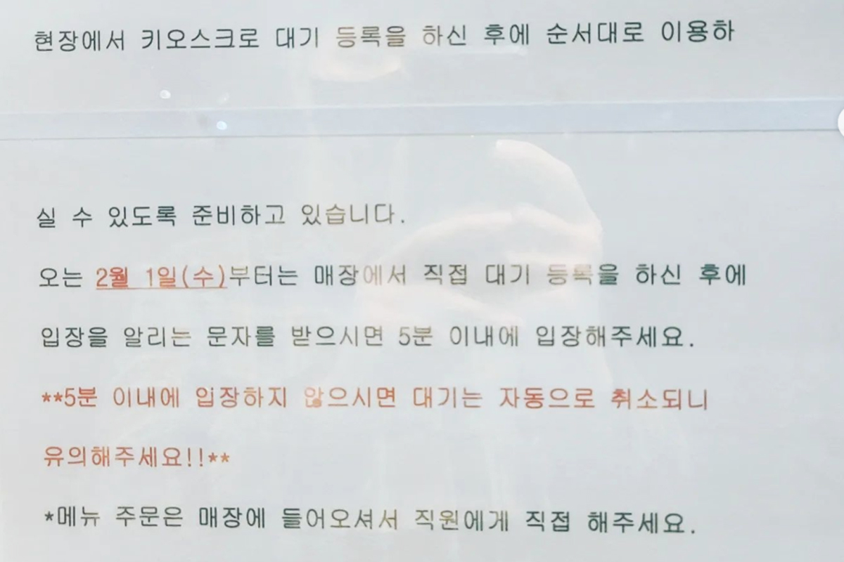 매장에서 직접 대기 등록 후 입장을 알리는 문자를 받으면 5분 이내에 입장해야 하는 것으로 진행됐죠.