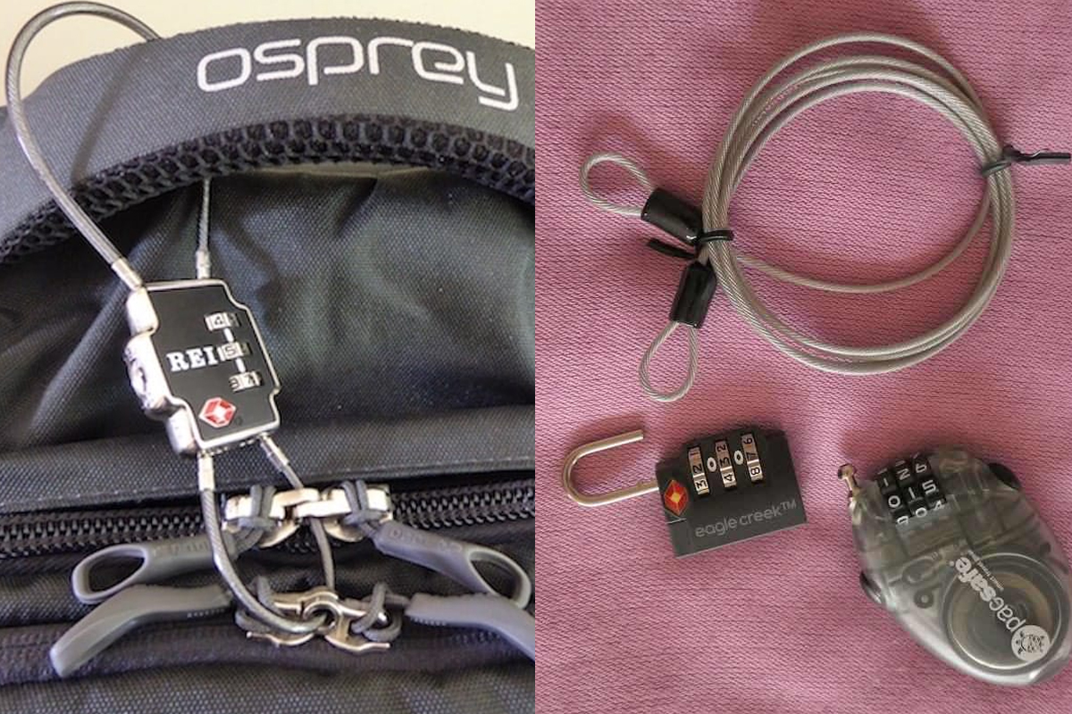우선, 캐리어는 물론 백팩에도 자물쇠를 걸어놓아야 됩니다. 백팩을 등에 메는 경우, 소매치기들의 표적이 되기 쉬운데요. 백팩의 작은 고리마다 와이어 자물쇠를 걸어놓으면 가방을 쉽게 열 수 없게 되죠.