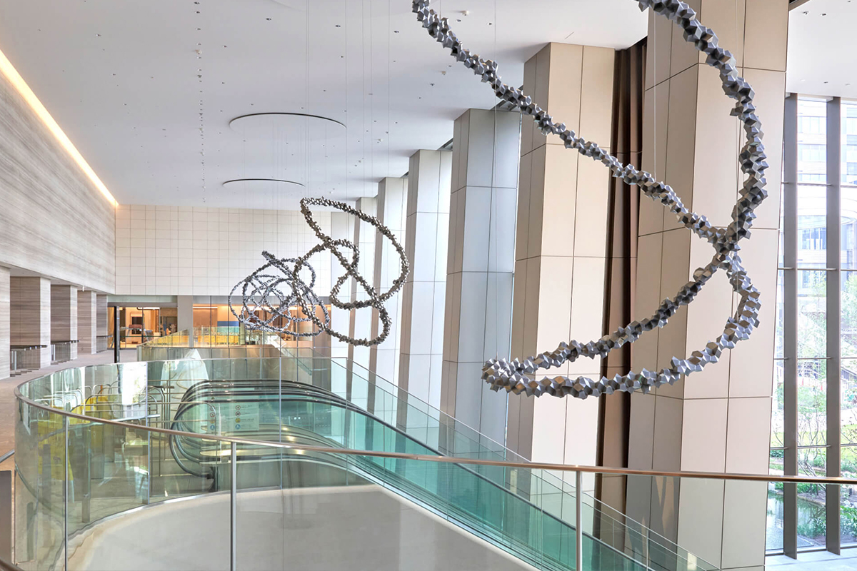 주변에는 카페, 식사 등을 할 수 있는 곳이 들어서 있으며 퍼블릭 아트가 곳곳에 설치되어 있습니다.