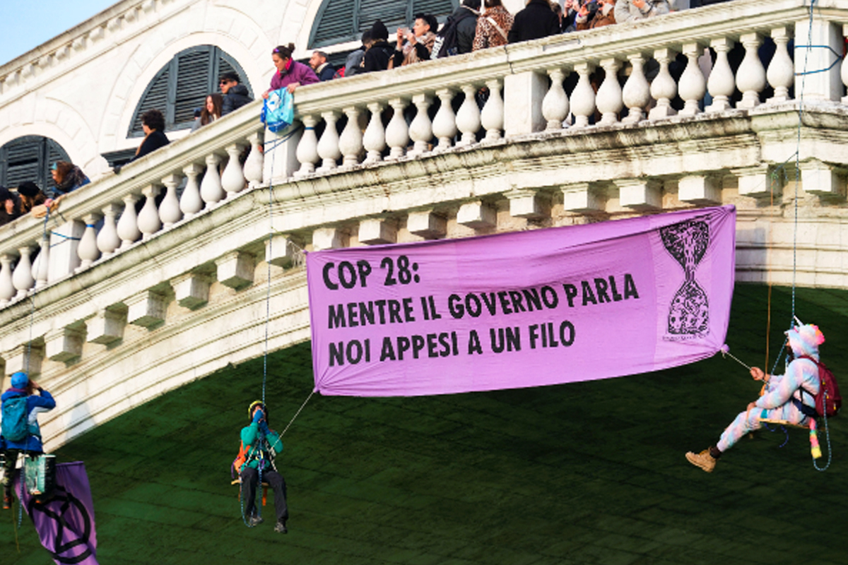 일종의 퍼포먼스로 ‘COP28: 정부가 말만 하는 동안 우리는 줄에 매달려 있다’라는 현수막을 펼쳤습니다.
