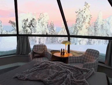 침대에 누워 핀란드의 겨울 풍경을 제대로 만끽할 수 있습니다.