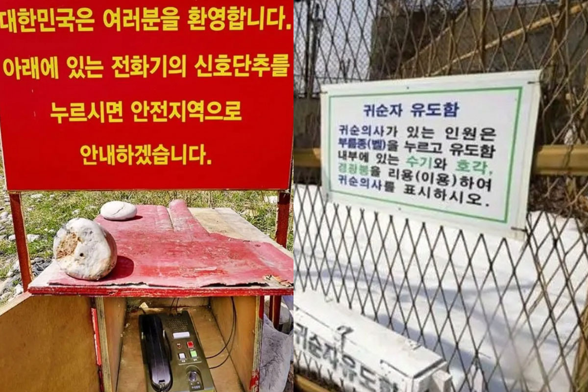 해당 사진 속에서 확인할 수 있는 것은 우리나라에 설치된 ‘귀순 유도벨’입니다. 귀순 유도벨은 우리 군이 북한군의 귀순을 유도하기 위해 안내판과 함께 설치한 인터폰인데요.