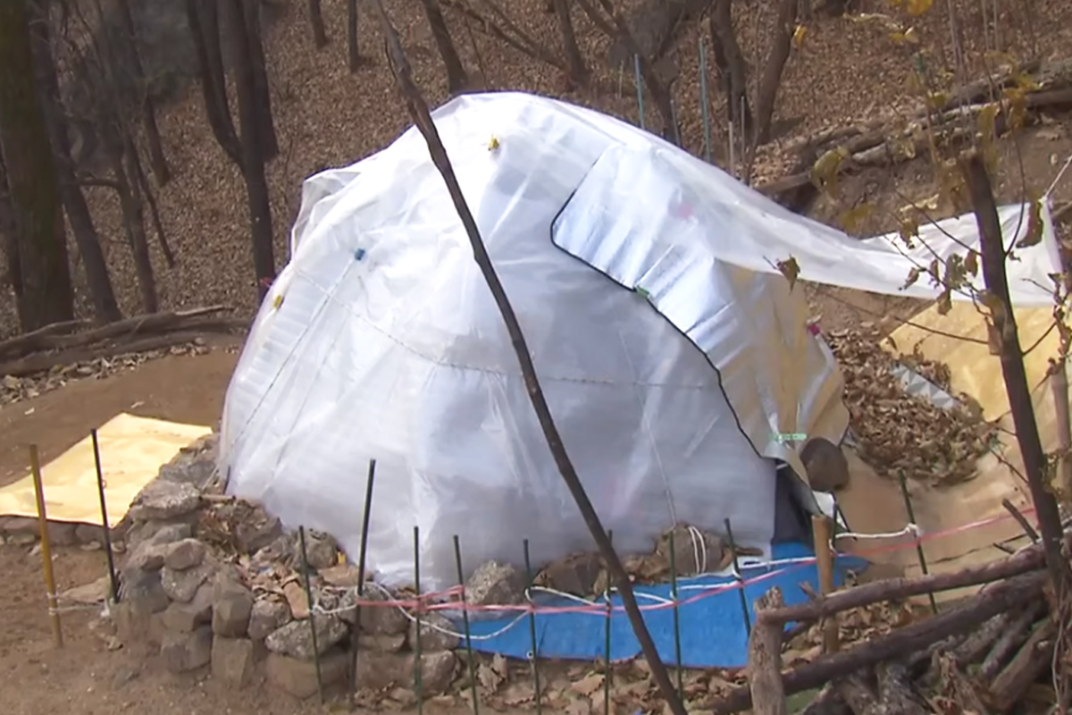 청계산에 놓여 있는 천막은 기도를 위해 산을 찾은 사람들이 가져다 놓은 것인데요.