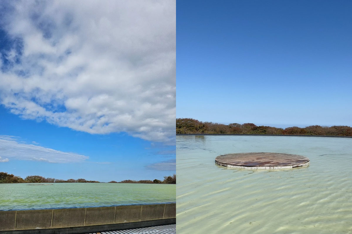 하늘연못은 이름 그대로 연못 속에 하늘이 비치는 절경을 보여주는데요. 지름 40m, 둘레 125m의 거대한 원형 연못 가운데에서 사진을 찍으면, 마치 하늘 속에 떠다니는 듯한 인생샷을 남길 수 있죠.