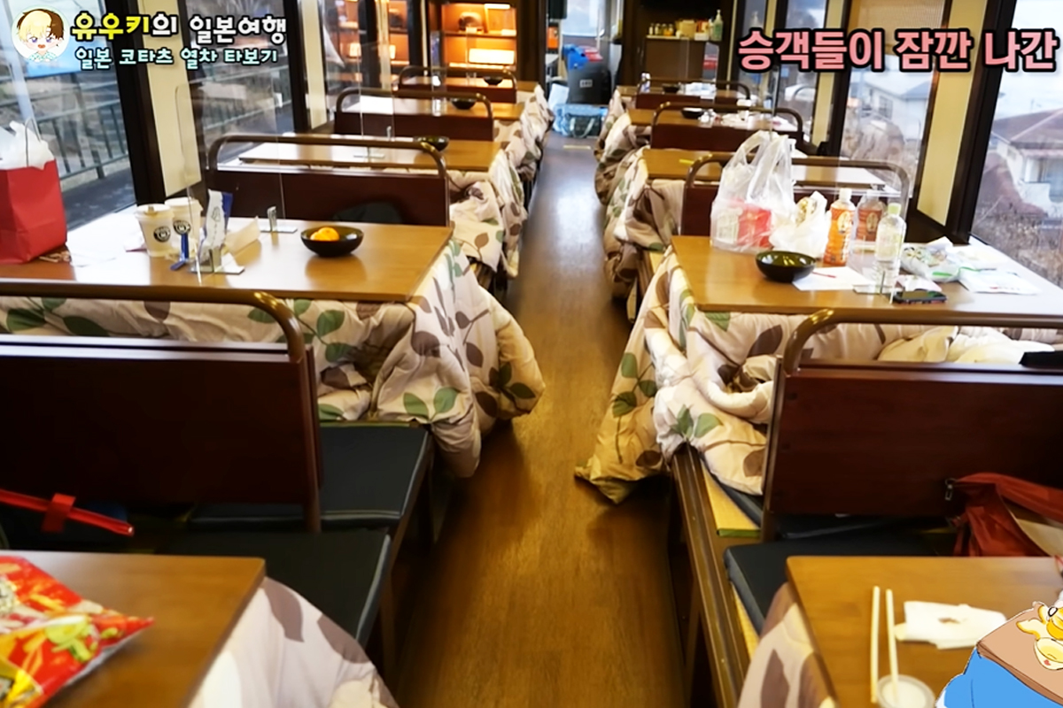 유튜버는 좌석마다 코타츠로 이루어져 있으며 의자 속에 열선이 깔려 있다고 설명했습니다.