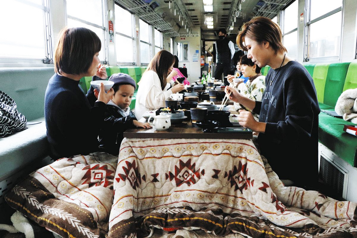 승객들은 코타츠 속에 몸을 넣고 따뜻함을 유지한 채로 기차 여행을 즐길 수 있습니다.