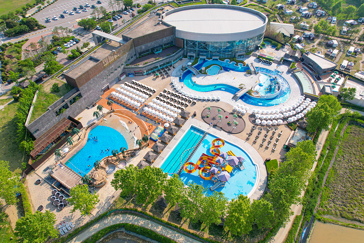 실내바데풀, 실외유수풀, 이벤트스파, 아웃도어스파, 키즈랜드, 아쿠아플레이 등으로 이루어졌습니다.