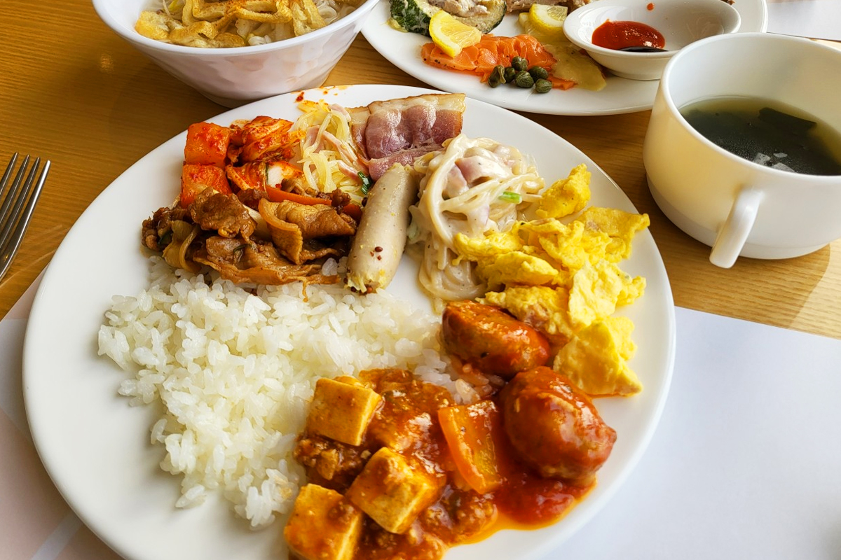 호텔에서 직접 만든 두부와 미트볼, 햄, 요거트, 머핀 등을 맛볼 수 있습니다.