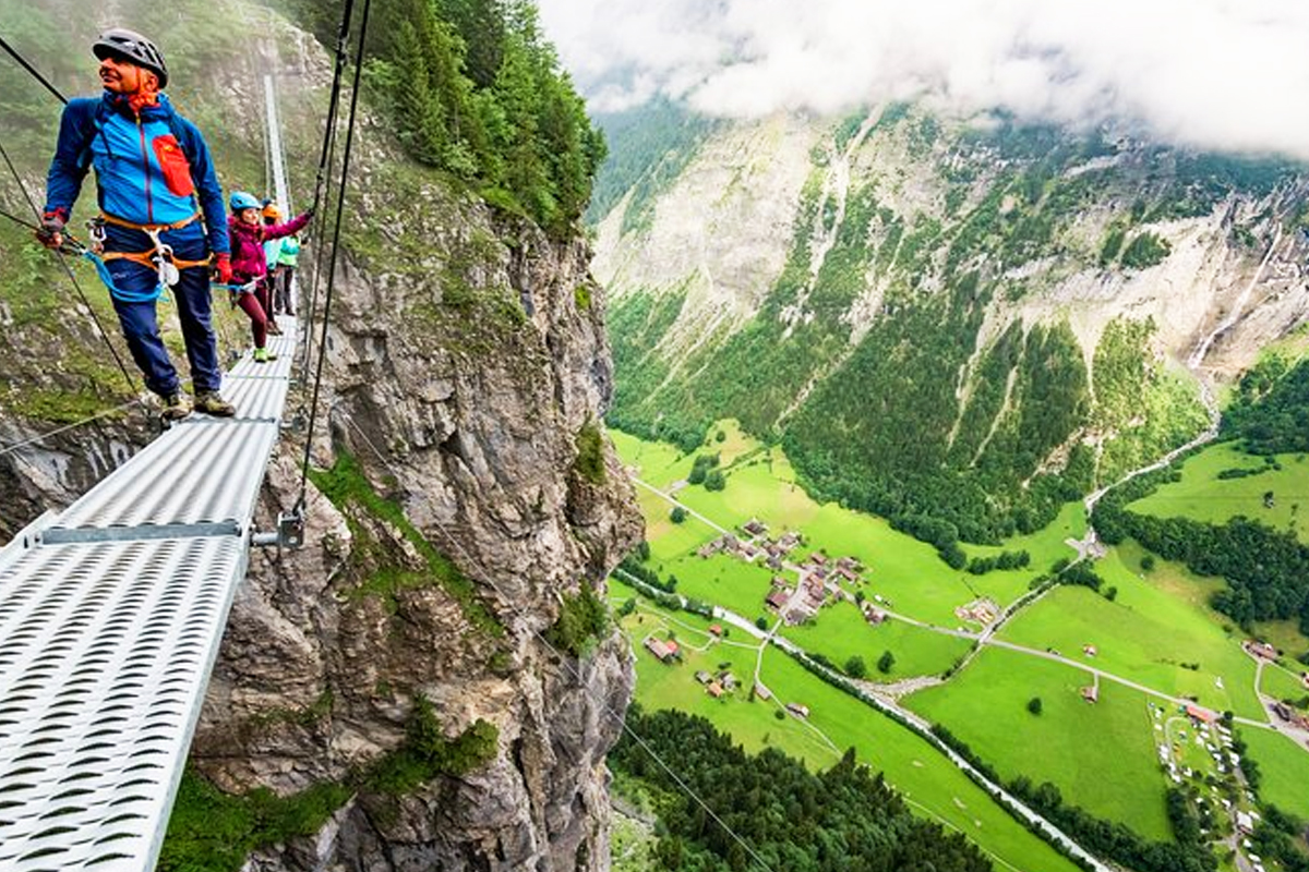 스위스 여행을 떠난다면 훨씬 더 안전한 다리와 아래에서 기다리는 식인 파충류 없이 ‘비아 페라타 뮈렌(Via Ferrata Mürren)’에서 환상을 실현할 수 있습니다.