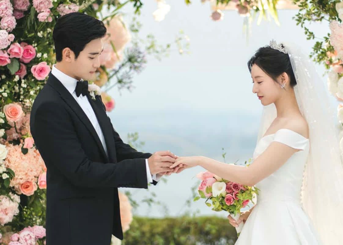 공개된 스틸컷에서는 김지원(홍해인 役)에게 웨딩링을 끼워주는 김수현(백현우 役)의 모습을 확인할 수 있는데, 어쩐지 손예진과 현빈 부부의 결혼식을 연상케 한다.