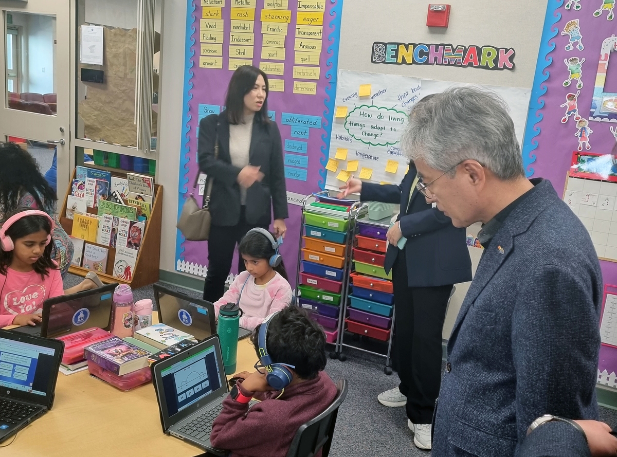 (창원=연합뉴스) 박종훈 경남도교육감이 6일(현지시간) 미국 캘리포니아주 샌디에이고 포웨이 스톤 랜치 초등학교 교실을 둘러보고 있다. 2023.12.7 [경남도교육청 제공. 재판매 및 DB 금지]