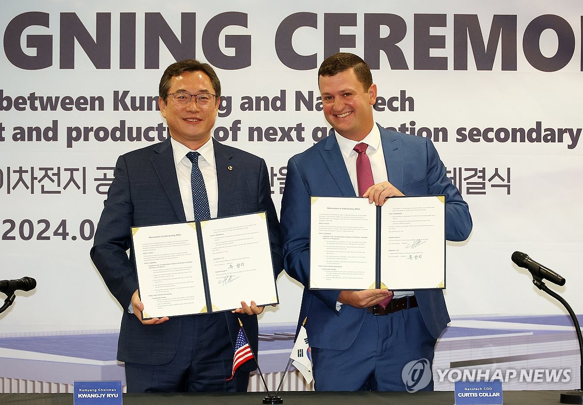 (부산=연합뉴스) 손형주 기자 = 20일 오후 부산 사상구 금양 본사에서 열린 미국 나노테크 에너지와 금양의 화재 억제력을 갖춘 차세대 배터리 공동개발과 생산을 위한 MOU 채결식에서 류광지 금양 회장과 커티스 칼라 미국 나노테크 에너지 최고운영책임자가 업무협약문을 들어 보이고 있다. 양측은 나노테크 에너지의 그래핀 소재 기술과 금양이 에스엠랩을 통해 구축한 하이니켈 97% 양극 소재 기술을 접목해 화재 억제력을 갖춘 원통형 배터리를 공동 개발, 생산하는 방안을 추진한다고 밝혔다. 2024.9.20 handbrother@yna.co.kr