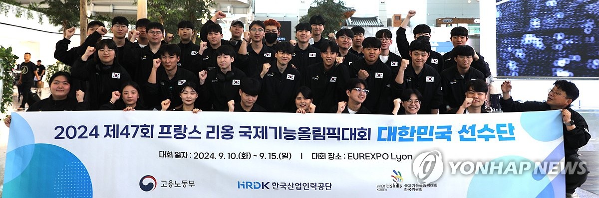 (서울=연합뉴스) 2024 제47회 프랑스 리옹 국제기능올림픽대회에 출전하는 대한민국 국가대표 선수단이 6일 인천국제공항을 통해 출국하기 전 기념 촬영하고 있다. 2024.9.6 [한국산업인력공단 제공. 재배포 및 DB 금지] photo@yna.co.kr