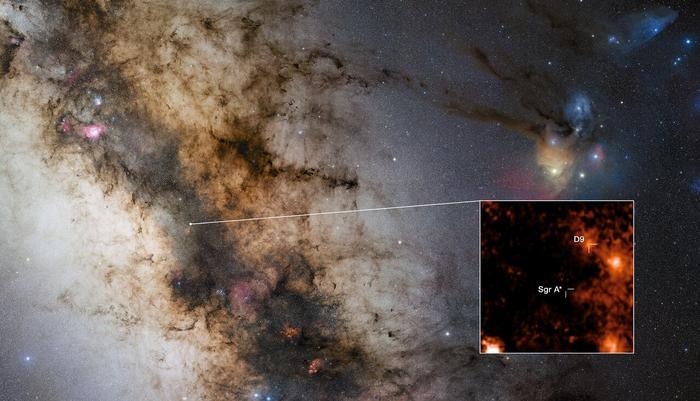 우리은하(Milky Way) 중심에 있는 초대질량 블랙홀인 '궁수자리 A*'(Sagittarius A*) 주위 궤도를 돌고 있는 새로운 쌍성계(D9) 위치. D9은 초대질량 블랙홀 근처에서 처음으로 발견된 쌍성으로, 유럽남방천문대(ESO) 초거대망원경(VLT)의 근적외선 통합 관측 분광기(SINFONI)가 수년간 수집한 스펙트럼에서 포착됐다. [ESO/F. Peißker et al., S. Guisard 제공. 재판매 및 DB 금지]