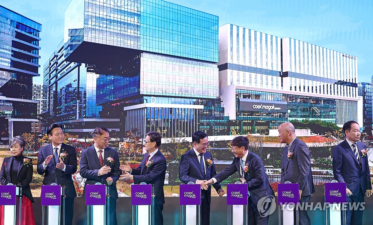 (서울=연합뉴스) 류영석 기자 = 28일 오전 개관식이 열린 서울 강서구 코엑스마곡 컨벤션센터에서 윤진식 코엑스 이사회 의장, 김상한 서울시 행정1부시장, 진교훈 강서구청장을 비롯한 참석자들이 개관 축하 퍼포먼스를 마친 뒤 서로 인사를 나누고 있다. 2024.11.28 ondol@yna.co.kr