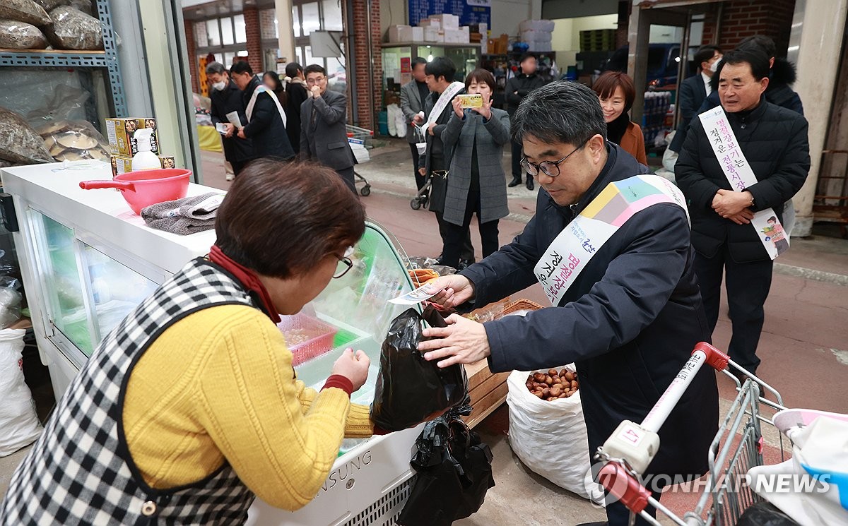 (서울=연합뉴스) 김성섭 중소벤처기업부 차관이 15일 전북 군산 신영시장을 방문해 온누리상품권으로 장을 보고 있다. 2025.1.15 [중소벤처기업부 제공. 재판매 및 DB 금지] photo@yna.co.kr
