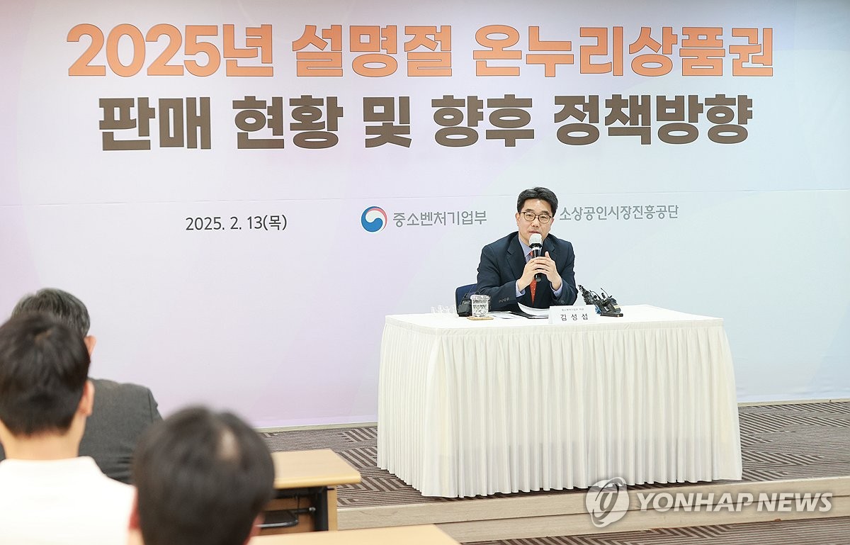 (서울=연합뉴스) 김성섭 중소벤처기업부 차관이 13일 서울 영등포구 중소기업중앙회에서 2025년 설명절 온누리상품권 판매 현황 및 향후 정책방향에 대해 설명하고 있다. 2025.2.13 [중소벤처기업부 제공. 재판매 및 DB 금지] photo@yna.co.kr