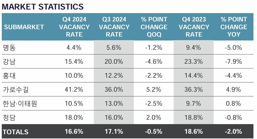 명동(4.4%)만이 10% 미만의 공실률을 나타냈다.
