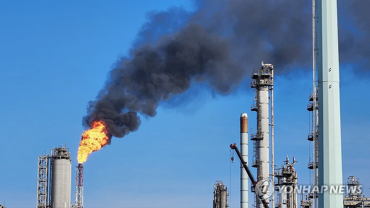 (서산=연합뉴스) 정윤덕 기자 = 25일 오전 충남 서산 대산석유화학단지 내 LG화학과 롯데케미칼에 전기 공급이 끊기면서 공장 가동이 멈춘 가운데 생산공정에 투입된 원료를 태우는 작업이 진행되면서 굴뚝에서 검은 연기가 뿜어져 나오고 있다. 2025.2.25 [독자 제공. 재판매 및 DB 금지] cobra@yna.co.kr
