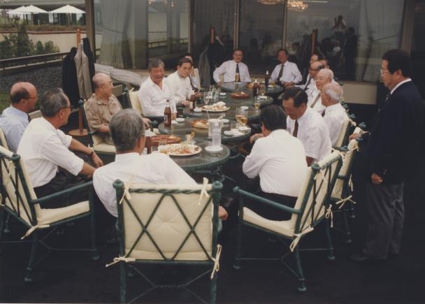 (서울=연합뉴스) 1996년 1월 최종현 SK 선대회장이 서울 한남동에서 조지 H. W. 부시 前 미국대통령과 만나 환담을 나누고 있다. 2025.4.2. [SK 제공. 재판매 및 DB 금지]