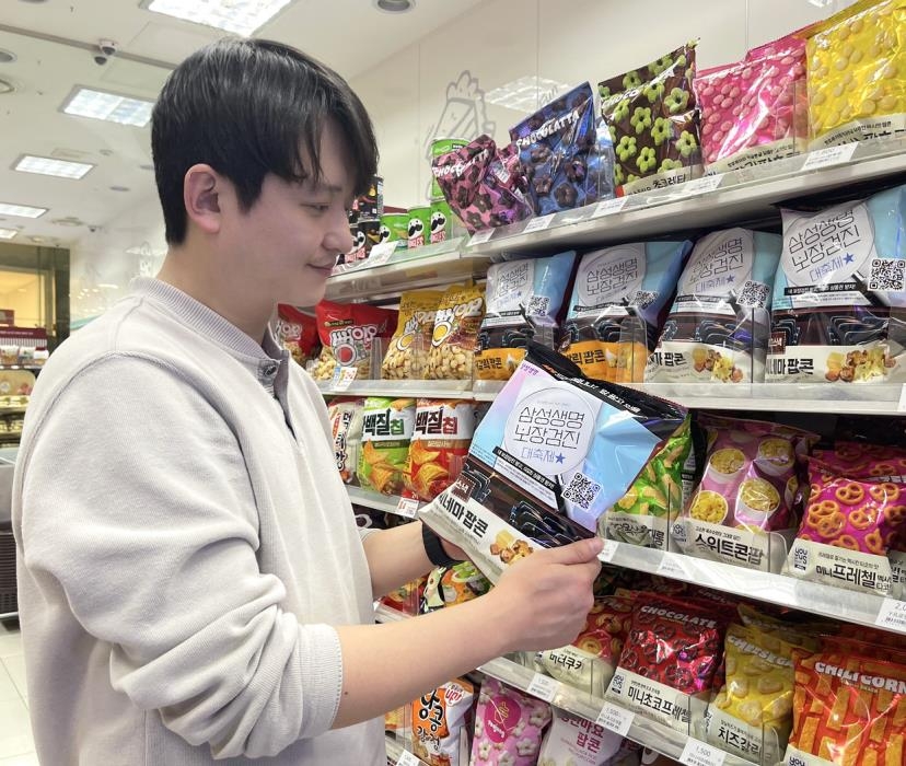 GS25는 첫 번째 광고 스낵으로 '2025 전국민 보장검진 대축제'라는 삼성생명 광고를 담은 팝콘 2종을 내놓았다.
