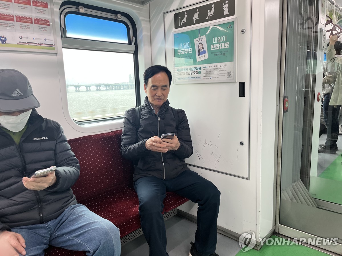 (서울=연합뉴스) 오인균 인턴기자 = 지난 2일 노인 택배원이 지하철을 타고 의뢰인을 만나러 가고 있다. 2025.04.13