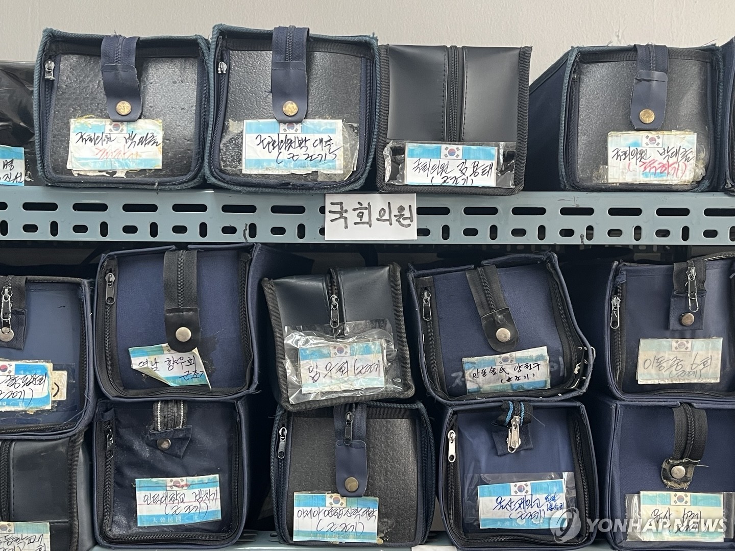 (서울=연합뉴스) 오인균 인턴기자 = 지난 2일 '실버퀵' 지하철 택배 사무실에 근조기가 차곡차곡 쌓여있다. 2025.04.13