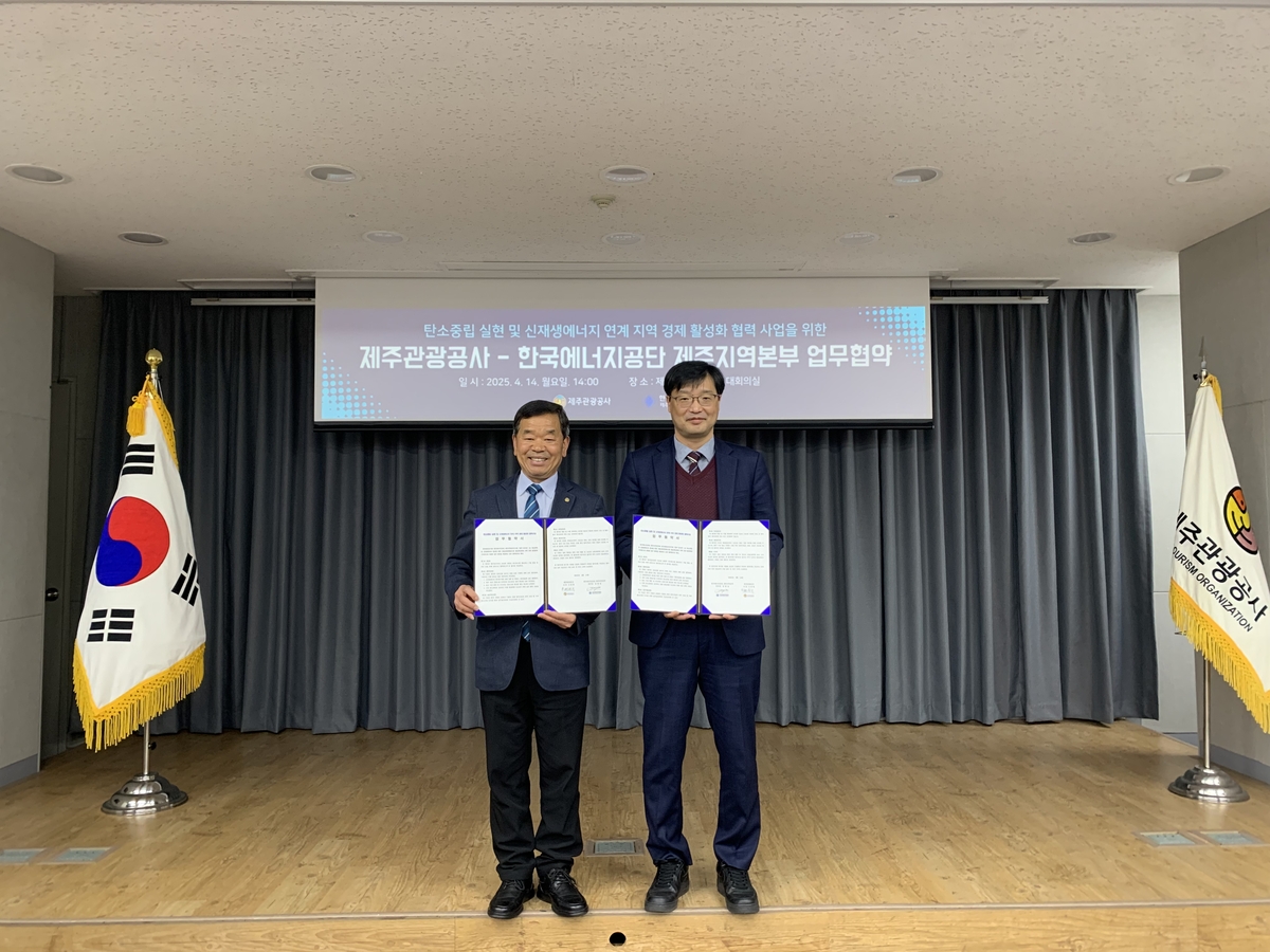 제주관광공사와 한국에너지공단 제주지역본부는 지난 14일 제주웰컴센터에서 '탄소 중립 실현 및 신재생에너지 연계 지역경제 활성화 협력사업 추진을 위한 업무협약'을 체결했다고 15일 밝혔다.