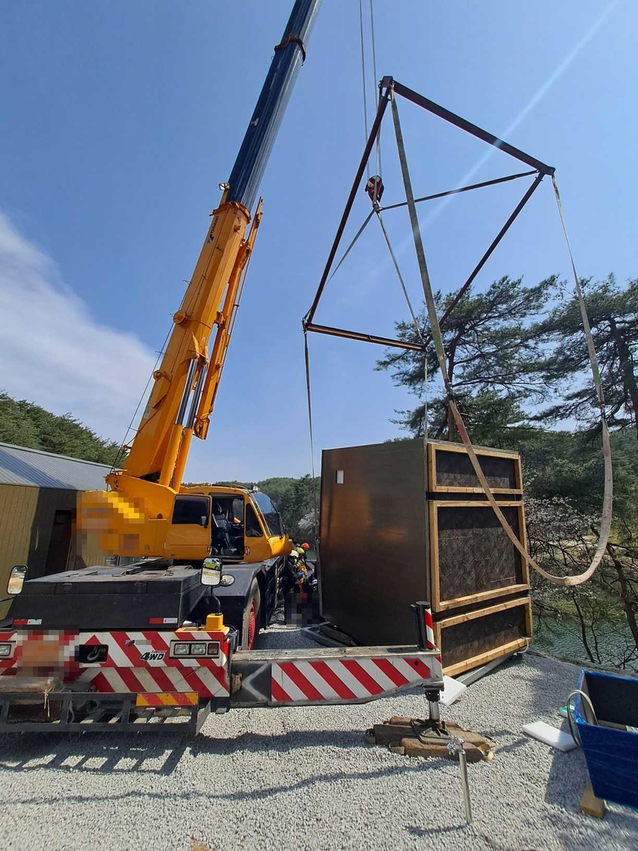 경찰은 크레인을 이용해 주택용 컨테이너를 옮기던 중 컨테이너가 균형을 잃고 전도된 것으로 보고 사고 경위를 조사하고 있다.