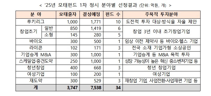 34개 벤처펀드의 규모는 7천538억원 수준으로, 모태펀드에서 3천747억원을 출자했다.