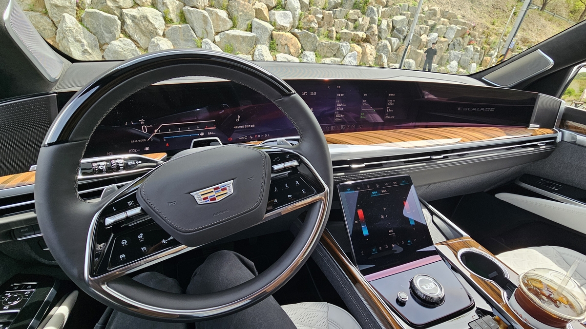 이번 에스컬레이드의 더욱 큰 변화는 내부에서 만나볼 수 있었다. 원래 38인치 유기발광다이오드(OLED) 디스플레이가 달렸던 인포테인먼트 시스템은 대시보드 전체를 덮는 55인치의 LED 스크린으로 크기를 키우고 성능을 높여 돌아왔다. 스크린 앞에는 커맨드 센터 디스플레이와 함께 전작의 기어봉에서 변경된 컬럼 타입 전자식 기어가 장착돼 조작이 편하면서도 깔끔한 느낌을 줬다.