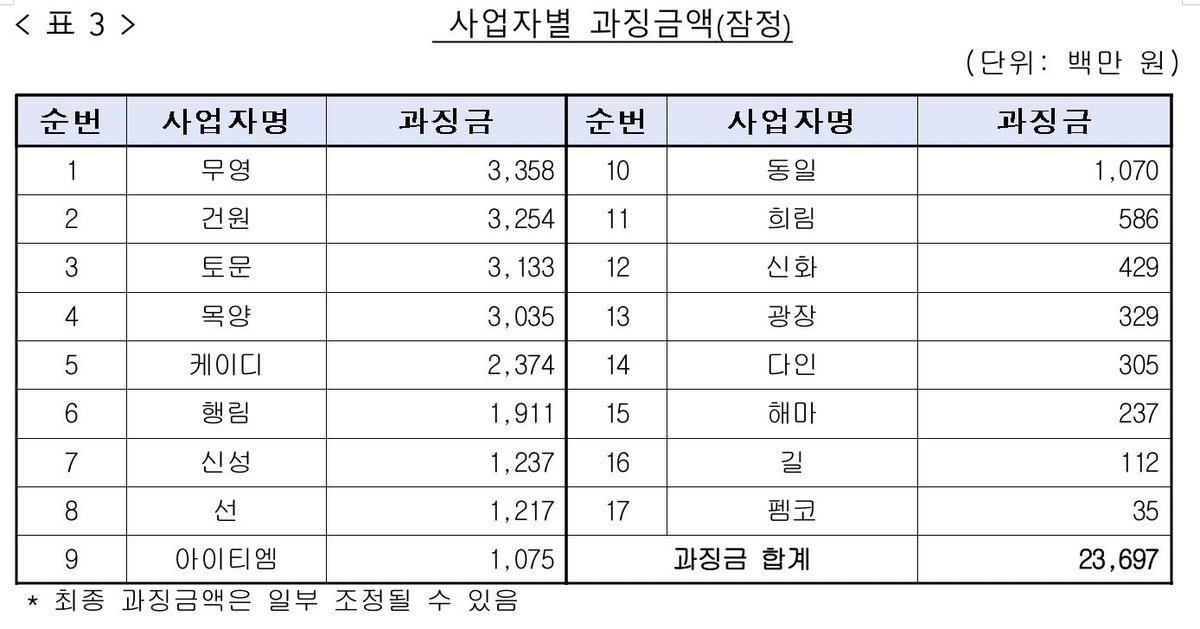 사무소별 과징금은 무영 33억5천800만원, 건원 32억5천400만원, 토문 31억3천300만원, 목양 30억3천500만원, 케이디 23억7천400만원, 행림 19억1천100만원 등이다. 1건의 입찰에 들러리로만 참가한 3개 사에는 과징금을 부과하지 않았다.