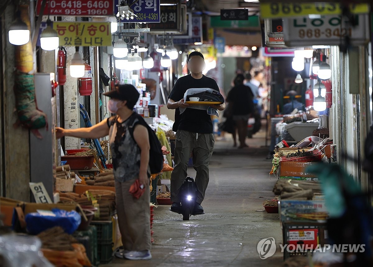 (서울=연합뉴스) 김도훈 기자 = 서울 지역 낮 기온이 35도를 기록하는 등 폭염이 계속되고 있는 19일 오후 서울 시내의 한 전통시장에서 한 상인이 전동휠을 타고 음식을 배달하고 있다. 2024.8.19 superdoo82@yna.co.kr