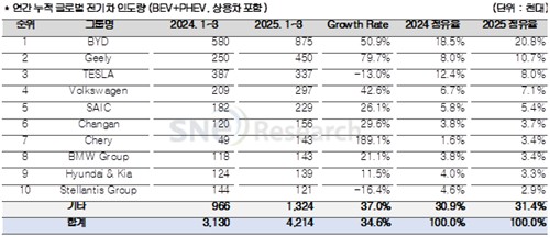 SNE리서치는 "BYD는 유럽과 동남아에 현지 공장을 설립하거나 확대하며 관세·보조금 변화에 능동적으로 대응하고 있다"면서 "지리그룹은 기술 개발과 생산 역량을 동시에 강화하고 있어 올해도 고성장세가 예상된다"고 분석했다.