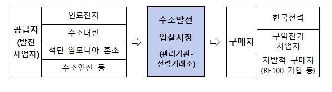 수소 발전 입찰 시장은 수소나 수소화합물을 발전 연료로 사용해 생산한 전기를 전력 당국이 장기 계약을 바탕으로 고정가로 구매해 소비자들에게 공급하는 제도다. 사용 연료에 따라 청정수소 발전과 일반수소 발전으로 구분한다.