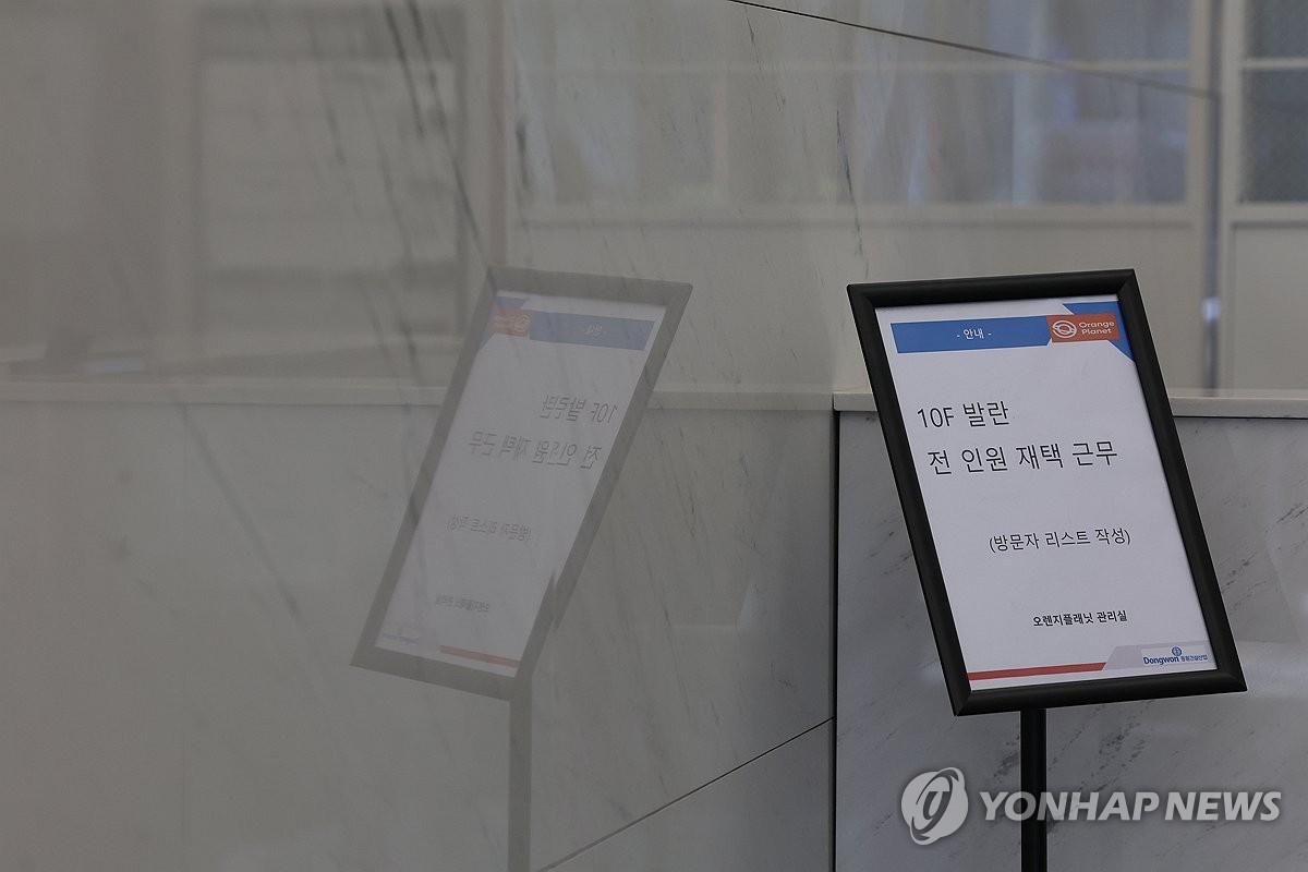 (서울=연합뉴스) 임화영 기자 = 명품 온라인플랫폼 발란이 서울회생법원에 기업회생절차(법정관리)를 신청한 가운데 1일 서울 강남구 발란 본사가 있는 공유오피스 로비에 '발란 전 인원 재택근무'라고 적힌 안내문이 놓여있다. 2025.4.1 hwayoung7@yna.co.kr